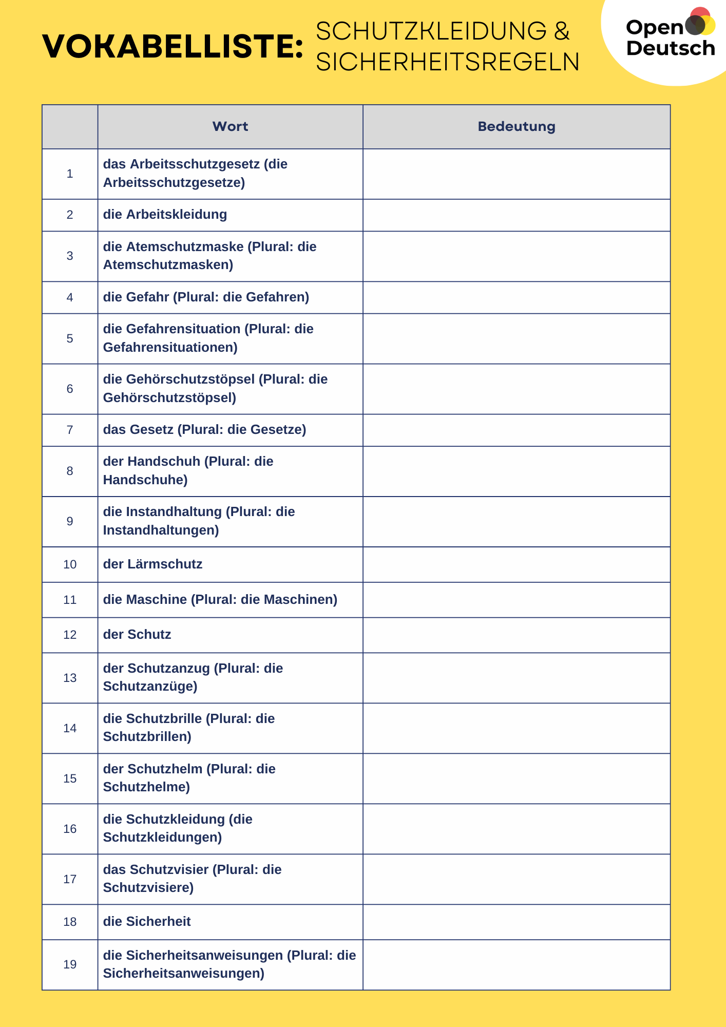 • Lerne zuerst die wichtigsten Vokabeln zur PSA (Persönliche Schutzausrüstung) kennen. Das sind bestimmte Geräte oder Bekleidung, die dich beim Arbeiten schützen.