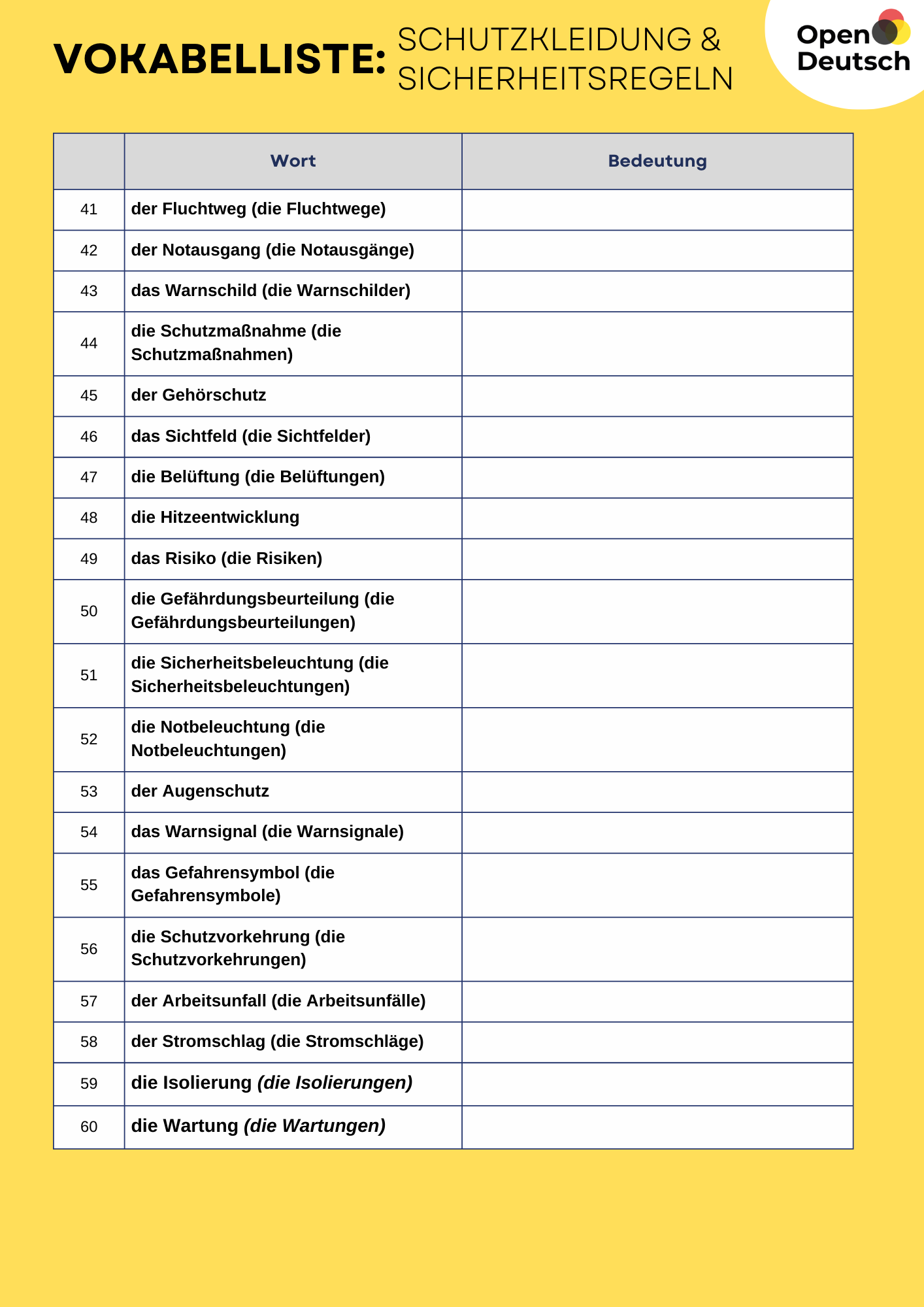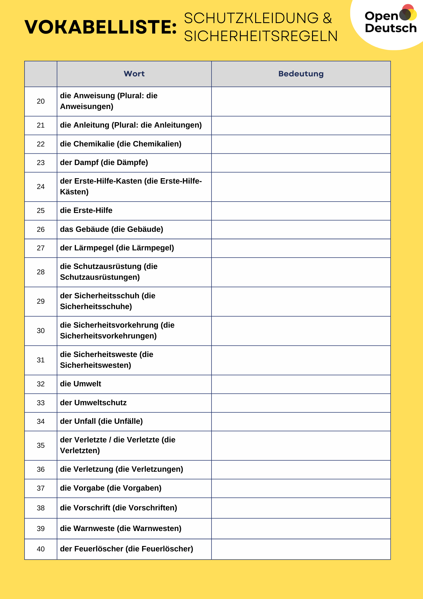 • Toll! Jetzt kennst du die wichtigen Wörter zur Sicherheit. 🎉