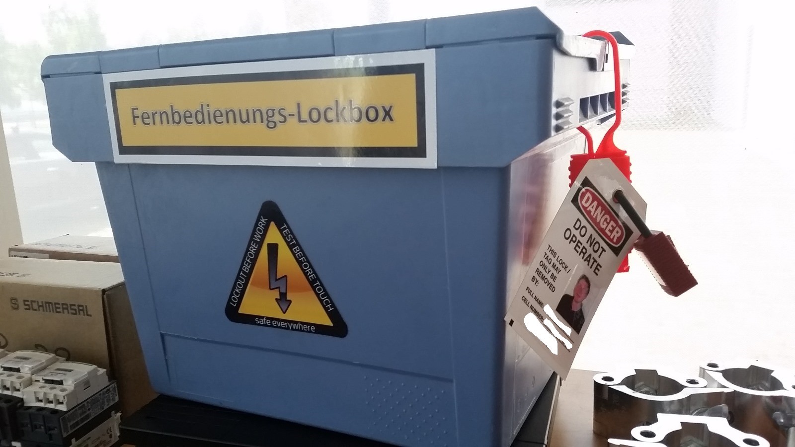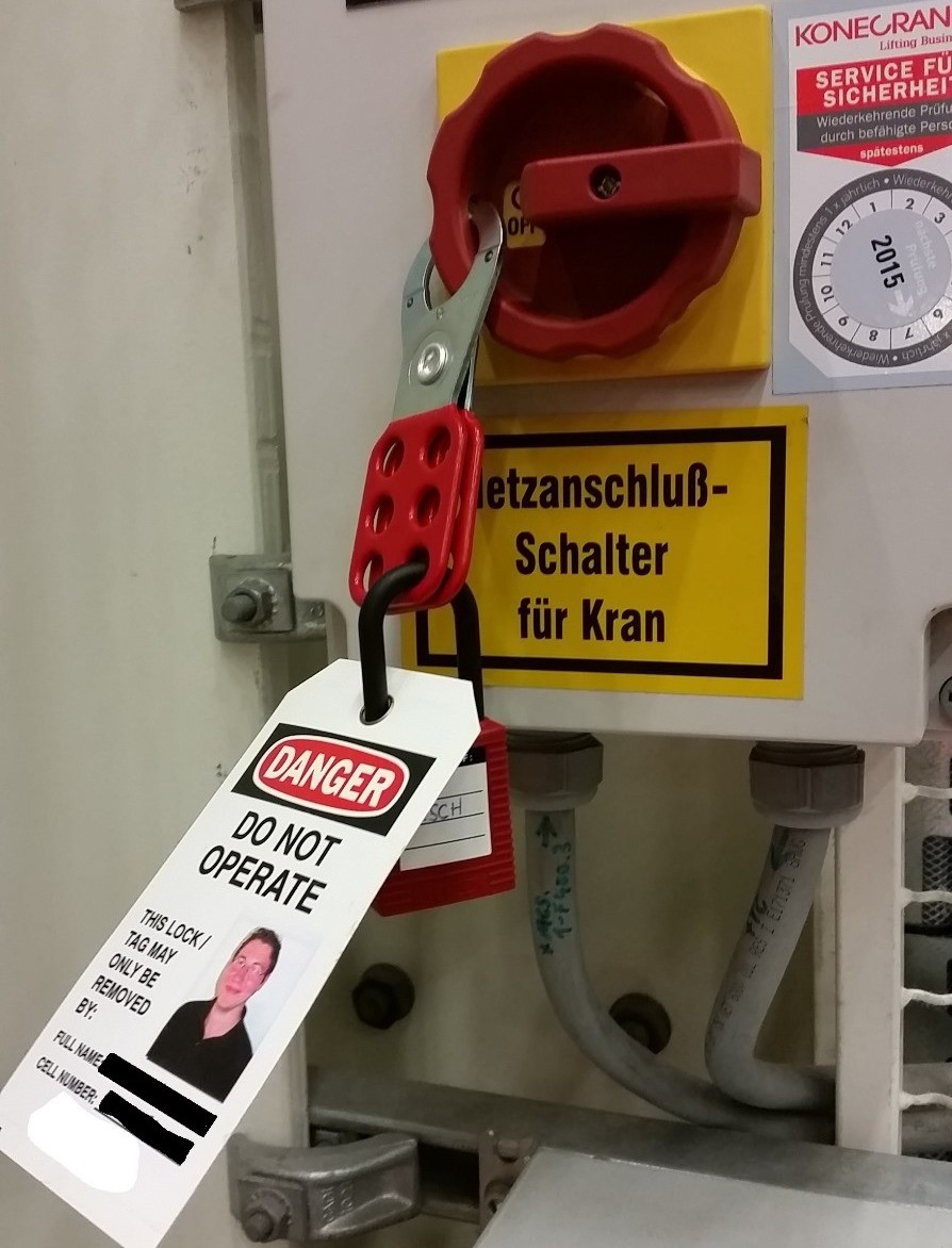 Keiner darf diese Maschine einschalten oder eine Kiste öffnen. Andere erkennen das an einem Schild, das "Tag" heißt. Auf diesem Schild steht normalerweise der Name und die Telefonnummer von der verantwortlichen Person und ein Bild.